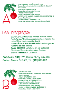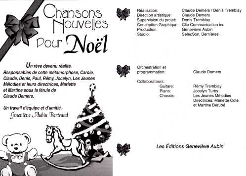 La cassette "Chansons nouvelles pour Noël" regroupe dix oeuvres inédites de quelques pionniers de la chanson à Québec dont font partie, entre autres, Geneviève Aubin Bertrand, Paul et Albert Bédard, Marius Delisle, Jean Royer et Carole Cloutier .