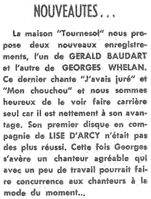 Comme "chanteur", il a réalisé trois 45 tours dont son premier en duo avec Lise D'Arcy pour le compte de Tournesol. Son deuxième disque, toujours avec Tournesol et produit lui aussi en 1964, , comprenait deux titres de l'auteur-compositeur français, Michel Paje (ce fut là le moins pire des trois). Enfin, son dernier simple sortit en 1966 sous l'étiquette Découverte. Par la suite, rempli de honte (je n'en suis pas certain), il se terra sous des "couvertes" mettant ainsi fin à sa carrière de chanteur, du moins sur disque. Un grand blagueur ce Georges Whelan!