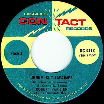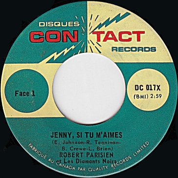On peut lire sur ce 45 tours "Robert Parisien et les Diamants noirs". Il s'agit en fait de leur premier disque. Par contre, sur leur deuxième simple (plus bas), apparait seulement le nom "Robert Parisien" alors qu'on aurait dû y voir également celui du groupe "Les Diamants noirs". Les deux 45 tours ont été réalisés en 1966.
