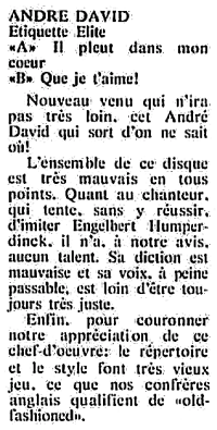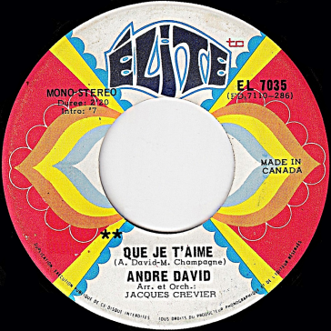 Élève de Gina Bausson au Conservatoire du Music-Hall, André David chante Que je t'aime qui n'a rien à voir avec la chanson de Johnny Hallyday sortie en 1969. Il semble apprécier le style "Engelbert Humperdinck".
