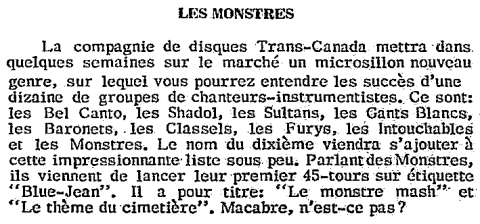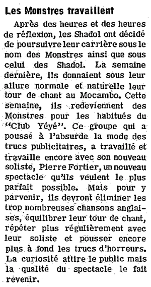 En 1965, les Shadols, habituellement vêtus de cuir, se métamorphosent en créatures hideuses pour se démarquer des autres groupes déguisés et s'appellent "Les Monstres". En spectacle, ils vont et viennent s'amusant à faire peur aux jeunes filles qui prennent un malin plaisir à s'égosiller.