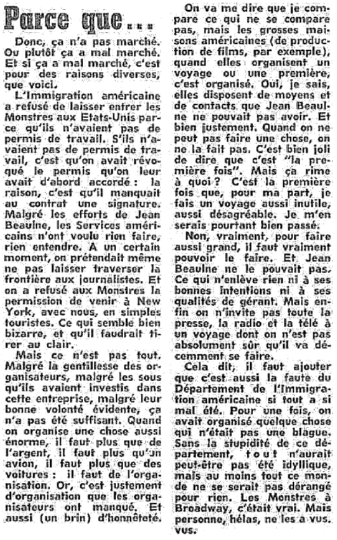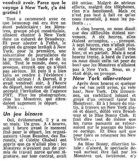 Le premier show devant les journalistes se solde par un "flop monumental", le soliste interprétant les chansons d'une manière assez maladroite. Plus tard, le groupe doit se produire dans une boîte new-yorkaise devant une pléiade de journalistes d'ici, invités pour cette première américaine annoncée avec grand renfort de publicité. Bloqués à la douane faute d'avoir les papiers appropriés, les Malheureux ne peuvent se rendre à destination où les attend pourtant une meute journalistique. Hélas! Ils brillent et brilleront par leur absence.