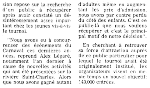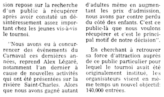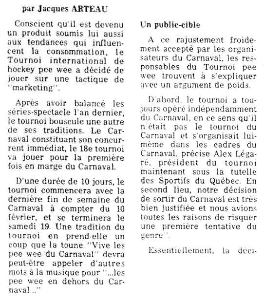 ne fait pas partie officiellement de l'organisation du Carnaval même. En fait, un autre organisme totalement indépendant s'occupe de mettre en branle chaque année cette compétition très réputée à travers le monde. Jusqu'en 1977, on a fait coincider les deux événements hivernaux, le tournoi de hockey débutant à la deuxième semaine des festivités carnavalesques.