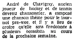 Depuis 1964, le tournoi international de hockey pee wee de Québec possède sa chanson-thème créée par l'auteur-compositeur et interprète québécois, André de Chavigny.
