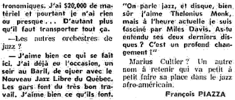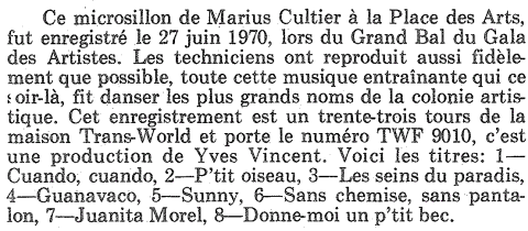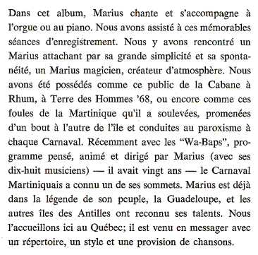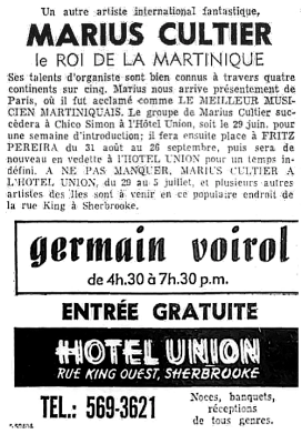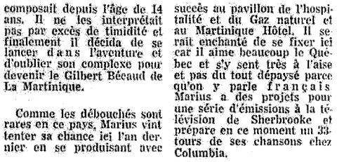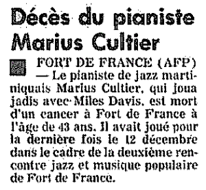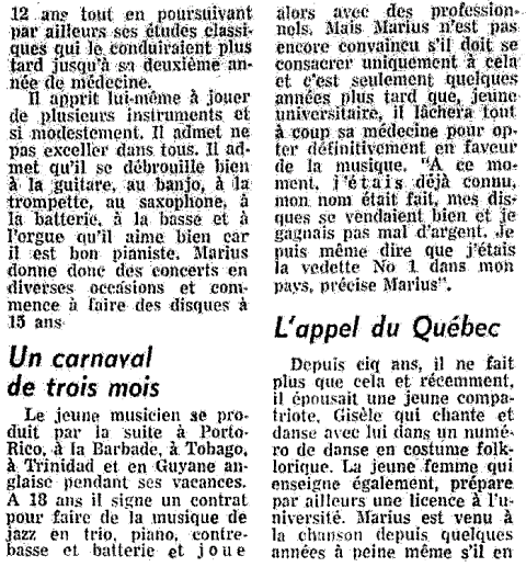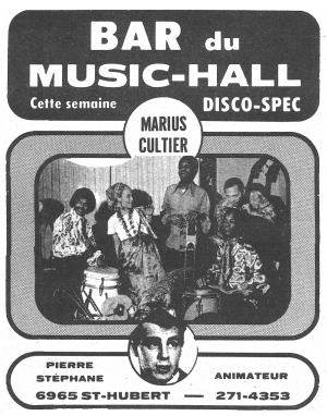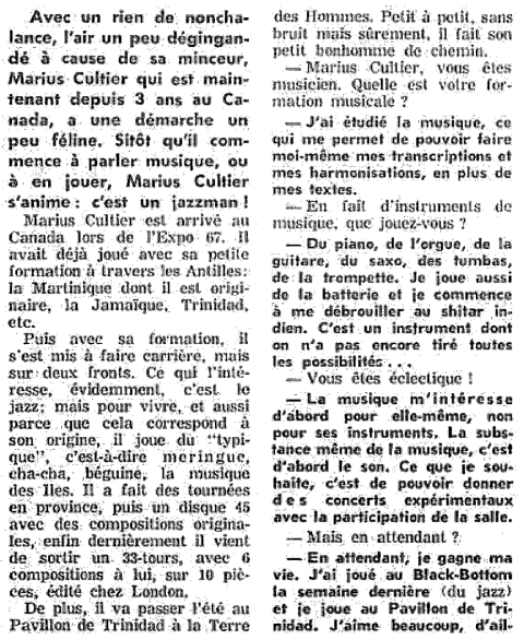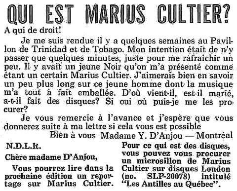 Musicien et chanteur martiniquais, Marius Cultier vient au Québec à la fin de 1966 présenter son spectacle à l'hôtel De Lido de Trois-Rivières. Il revient l'année suivante (dans le cadre de l'exposition universelle de Montréal) donner des récitals de musique antillaise à "Terre des hommes". Il réside ici durant quelques années où il remplit plusieurs contrats dans différentes boites surtout dans la grande région métropolitaine. Il réalise chez nous trois microsillons entre 1969 et 1972: le premier chez London et les deux autres chez Transworld. En compagnie de son épouse, Gisèle, et de ses musiciens, "Marius de la Martinique" entreprend à l'occasion quelques tournées qui le mènent jusqu'aux États-Unis. Vers 1974, il part pour la France afin d' y poursuivre sa carrière. En 1985, à Fort de France, il décède à l'âge de 43 ans, emporté par un cancer.