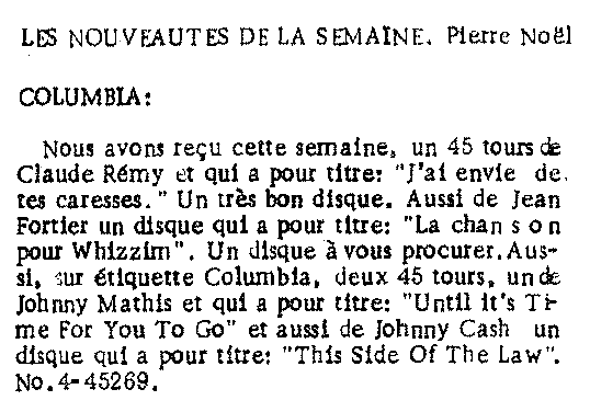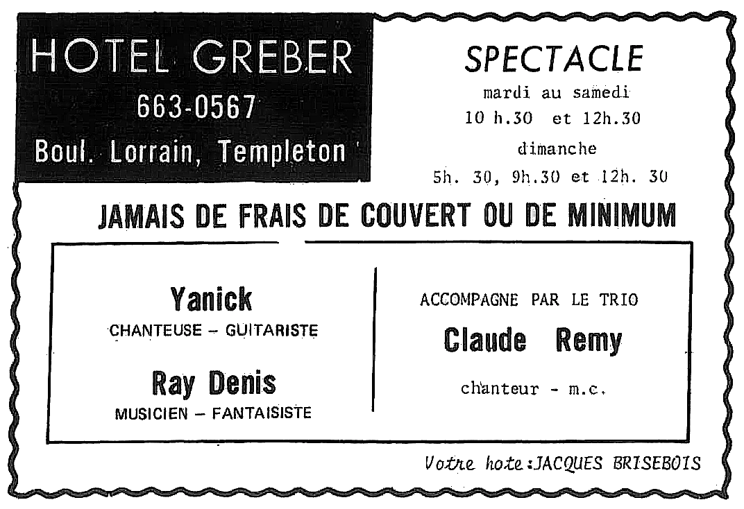 Le Ray Denis (Raymond Denis, musicien fantaisiste) qui se produisait en 1972 à l'Hôtel Greber á Templeton (banlieue proche de Gatineau) faisait partie du duo Ray Denis & Mo B. (Maurice Bourbonnais) qui se produisait dans les cabarets principalement de Montréal entre 1954 et le milieu des années 1960. Robert Thérien