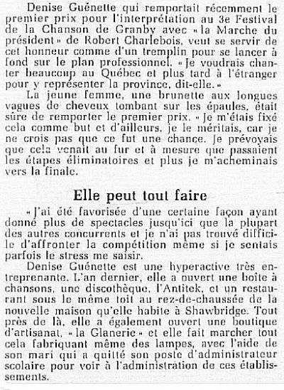 "Denise Guénette a remporté le premier prix d'interptétation au 3e Festival de la chanson de Granby en 1971."