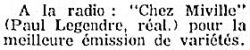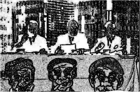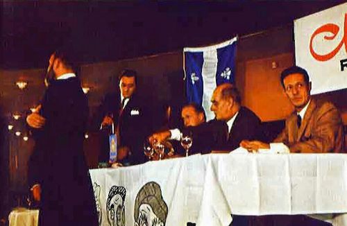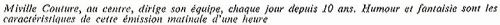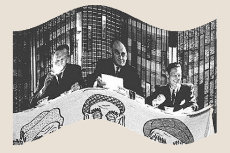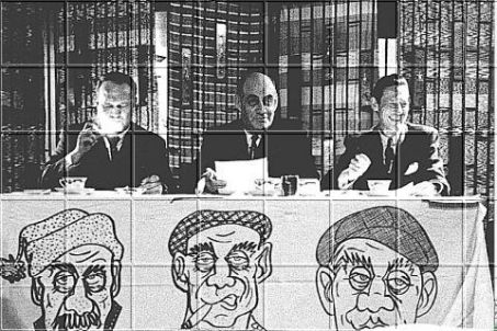 Photo illustrant une émission-déjeuner avec l'équipe de "Chez Miville" : Jean Mathieu, Miville Couture et Jean Morin. Sur la nappe, sont illustrées des caricatures personnifiées par Miville.