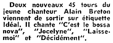 Alain Breton a plusieurs 45 tours et un long-jeu à son actif... Par contre, les articles de journaux à son sujet semblent très rares!