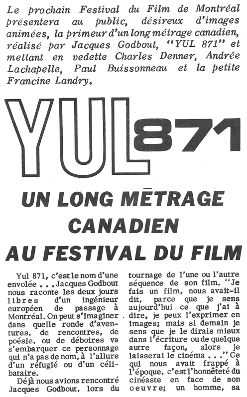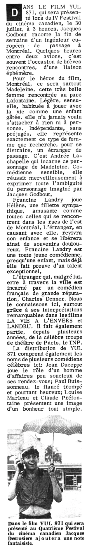 Canada. L'Office national du film présente Charles Denner, Andrée Lachapelle, Paul Buissonneau, Francine Landry, Jean Duceppe, Boudha Bradon, Les Jérolas, Jacques Normand, Jacques Desrosiers, Claude Préfontaine, Louise Marleau, Victor Désy, Violette Bussy, Connie Kilbourn dans YUL 871 , un film de Jacques Godbout. Dialogues : Jacques Languirand. Décors : Frédérick Back. Caméra : Gilles Gascon. Assistants à la réalisation : Jacques Leduc, Arnold Gilbart. Régie : Marcel Malacket assisté de Bernard Lalonde. Stagiaire : Pierre Audet. Script-girl : Aimée Danis. Accessoiriste : Denis Boucher. Maquillage : Claude Pierre-Humbert. Chef électricien : Maurice de Ernsted. Assistants cameramen : Réo Grégoire, Roger Rochat. Électricien : Séraphin Bouchard. Grip : Serge Chergueï. Costumes : Licha et Dinardo. Titres : André Théroux. Conseiller musical: Fernand Ouellette. Ingénieur du son : Claude Pelletier. Post-synchronisation : Jean-Pierre Joutel. Montage sonore : Bernard Bordeleau. Mixage : Ron Alexander, Roger Lamoureux. Montage : Victor Jobin assisté de Georges Mayrand. Musique : François Dompierre et Stéphane Venne. Eléments électroniques : Mayron Schaeffer. Layla, Layla interprétée par Jack Brass; Je ne suis pas tout à moi : Paroles : G. Richer. Musique : Jérôme Lemay. Directeur de la photographie : Georges Dufaux, c.s.c. Scénario et réalisation : Jacques Godbout. Producteur : André Belleau. [Générique de fin] © Office national du film du Canada. MCMLXVI.