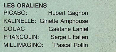 avec Hubert Gagnon (Picabo), Ginette Amphouse (Kalinelle), Gaétane Laniel (Couac), Serge L'Italien (Francolin) et Pascal Rollin (Millimagino).