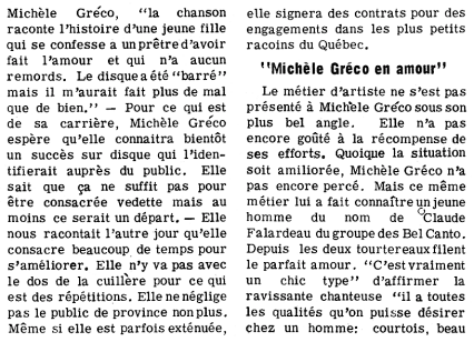 En septembre 1966, Michèle Gréco épousa Claude Falardeau des Bel-Canto. Ce dernier quitta le groupe en 1968 et forma avec sa conjointe le duo "Elle et Lui".