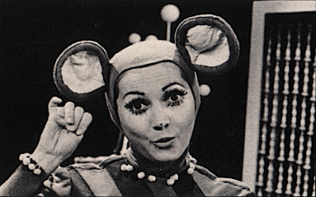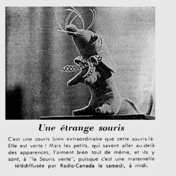 La Souris verte s'est métamorphosée avec le temps. Les deux photos du haut représentent la première et la deuxième année de l'émission mise en ondes en 1964. Puis en 1966, Louisette Dussault incarne une Souris verte bien vivante (en bas à gauche) qui prendra un peu plus tard une apparence plus définitive (à droite).