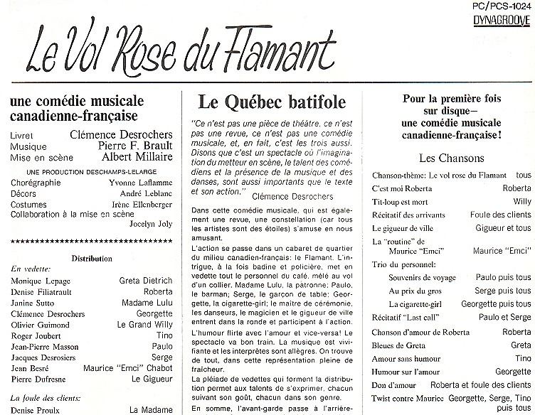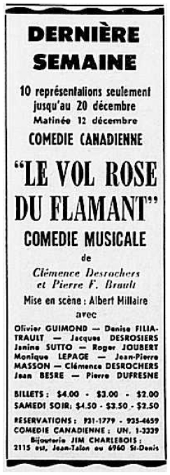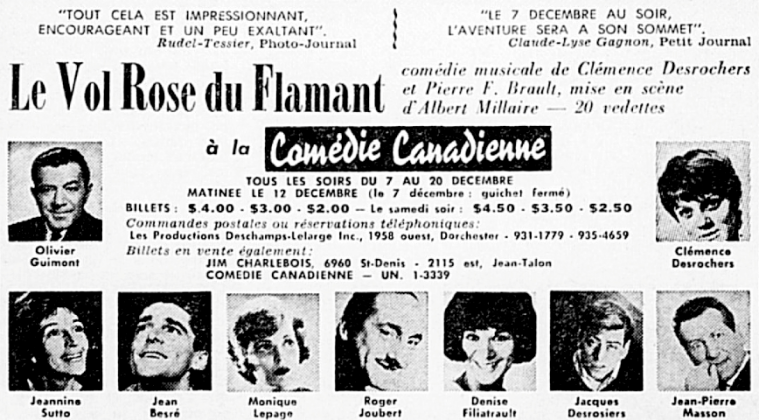 Au moment où j’écris ces lignes, il ne reste plus que quelques heures avant que le rideau ne se lève à la Comédie-Canadienne sur la première du “Vol rose du flamant”, de Clémence Des Rochers et Pierre Brault, une comédie musicale qui réunit le talent de notre Clémence, d’une jeune compositeur qu’on dit plein de talent et d’interprètes qui s’appellent Monique Lepage, Denise Filiatrault, Janine Sutto, Clémence Des Rochers. Olivier Guimond (on ne s’est privé de rien!), Roger Joubert, J-Pierre Masson. Jacques Desrosiers, Jean Besré, Pierre Dufresne et Denise Proulx, et encore Micheline Gérin, Paul Gauthier, Claude Michaud, Yvonne Laflamme, Ugo Roméro, Rita Imbault, Patrice Poirier, Denise Andrieu, Claude Préfontaine et Paul Baillargeon (qui dirigera l’orchestre mis sur la scène. là où il se doit être).