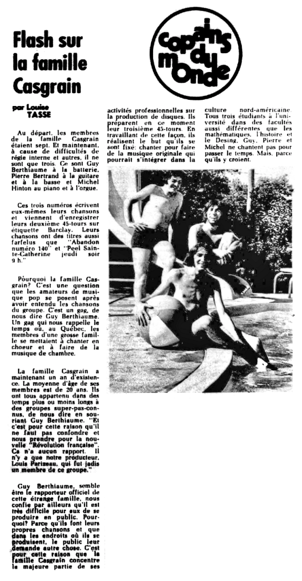 La Famille Casgrain (le nom n’a aucune signification particulière) est formé au printemps de 1969 autour du chanteur Pierre Voyer et du guitariste Jean-Guy Durocher. Viennent se joindre au début le claviériste Michel Hinton et le guitariste Michel Rivard, en plus du batteur Louis Parizeau (ex-Sinners). Ce dernier devient producteur du groupe et est remplacé par Guy Berthiaume. Peu après, Michel Rivard quitte le groupe et est remplacé par Pierre Bertrand. La Famille Casgrain enregistre á l’automne 1969 un premier 45 tours chez Barclay comprenant deux chansons de Pierre Voyer et Jean-Guy Durocher qui ont également composé les deux chansons du deuxième 45 tours paru en juillet 1970. Voyer et Durocher quittent le groupe. Hinton, Bertrand et Berthiaume continuent pendant un court laps de temps.