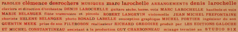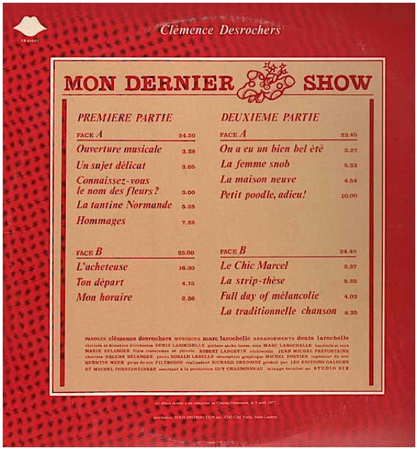 Clémence DesRochers, Mon dernier show, FR 41001 (album double), 1977 - verso.