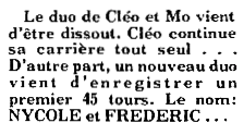 Après avoir quitté "Les Pieds Fous", Cléo (Diane Lavoie) et Mo (Maurice Bélanger, ancien Romain de César) réalisèrent deux simples: l'un sur étiquette CANUSA et l'autre, sur étiquette VEDETTES.