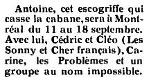 Une autre Cléo fit son apparition avec Cédric, un duo français accompagnant Antoine lors de sa tournée au Québec.