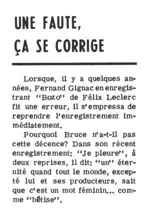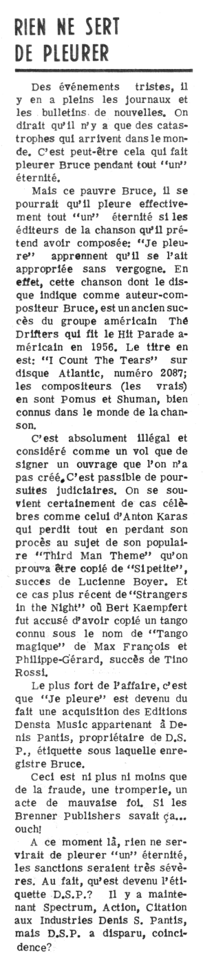 Dans sa chronique hebdomadaire dans "Échos Vedettes", le journaliste Jacques Duval y va de quelques critiques à l'égard du chanteur Bruce et du propriétaire de la compagnie de disques, Denis Pantis, à propos de la chanson "Je pleure".