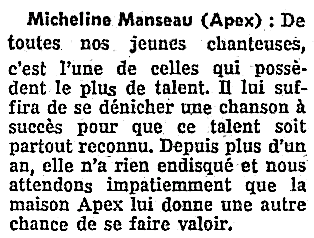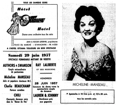 (vers 1956-1966) à la radio, à la télévision et au cabaret. Elle a réalisé trois 45 tours sur trois étiquettes différentes. Elle était la cousine et amie de Rolande DesOrmeaux. Radiomonde et Télémonde, 20 décembre 1958
