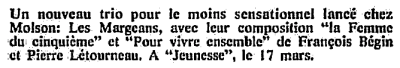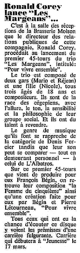 Trio formé de deux gars et d'une fille, les Margeans ont enregistré trois chansons dont l'une apparaît sur leurs deux 45 tours. Ils ont participé à quelques émissions de télé comme Boubou, Discomanie et Jeunesse au cours de l'année 1973.