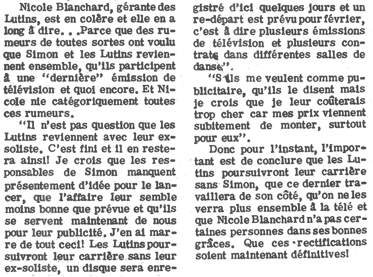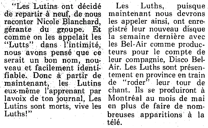 L'aventure des Lutins terminée, place aux Luths avec Serge Lambert (guitare solo), Alain Blanchard (guitare basse), Richard Guillemette (guitare rythmique) et un nouveau batteur, Ghyslain Pion. Nicole Blanchard demeure gérante du nouveau groupe.