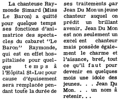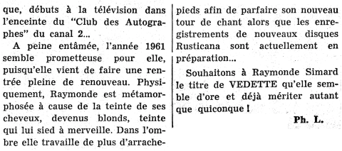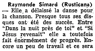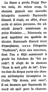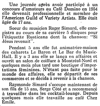 Native de Laval-des-Rapides, Raymonde Simard débute assez jeune dans le métier. D'abord comme "chanteuse de genre" (peut-être davantage associé au chant lyrique) sous le nom de Ramona Simard, puis comme danseuse sous le nom de Peggy Norton. Elle entreprend sa véritable carrière de chanteuse sous son vrai nom en réalisant quelques 45 tours avec la maison Rusticana de Roger Miron de 1959 à 1961. Son microsillon sur Rusticana, produit semble-t-il en 1964, comprend huit chansons provenant de ses 45 tours. Deux pièces instrumentales interprétées par le saxophoniste invité M. Sax, complète l'album. On l'a surnommée "Miss Le Baron" en raison de son engagement à long terme comme animatrice à ce cabaret. En 1963, on souligne joyeusement ses douze ans de vie artistique.