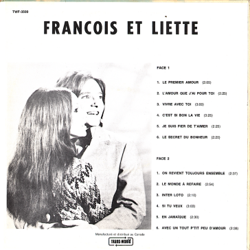François et Liette: Le premier amour/ L'amour que j'ai pour toi/ Vivre avec toi (Be My Baby)/ C'est si bon la vie (If I Needed Someone)/ Je suis fier de t'aimer/ Le secret du bonheur (24 Hours From Tulsa)/ On revient toujours ensemble/ Le monde à refaire (Get Together)/ Inter-Loto/ Si tu veux/ En Jamaïque/ Avec un tout p'tit peu d'amour