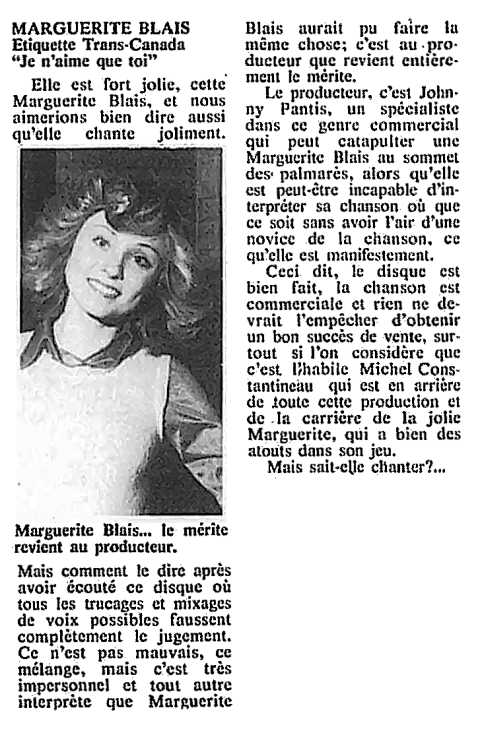 Jouissant d'un milieu familial très favorable, Marguerite Blais développe très jeune de multiples talents qu'elle mettra à profit dans sa vie d'adulte. Elle termine deuxième au concours Mademoiselle Québec en 1972. Elle se fait remarquer par une personnalité rayonnante qui ne laisse personne indifférent. Suite à cette compétition, de nombreuses portes s'ouvrent devant elle. Comme chanteuse, elle enregistre trois 45 tours en 1973 et 1974. Son deuxième, avec la chanson Je n'aime que toi est diffusé en France sur Decca.