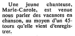 Marie-Carol, deux prénoms et un joli visage , réalise son unique 45 tours en 1972 sur étiquette Trans-Canada. Son disque compte parmi les meilleurs vendeurs de l'été et sa chanson Les vacances atteint la sixième position au palmarès.