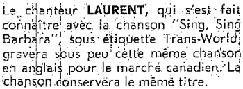 Malgré les six 45 tours commercialisés chez nous, je n'ai trouvé aucune trace de sa présence au Québec dans les journaux et les revues disponibles.