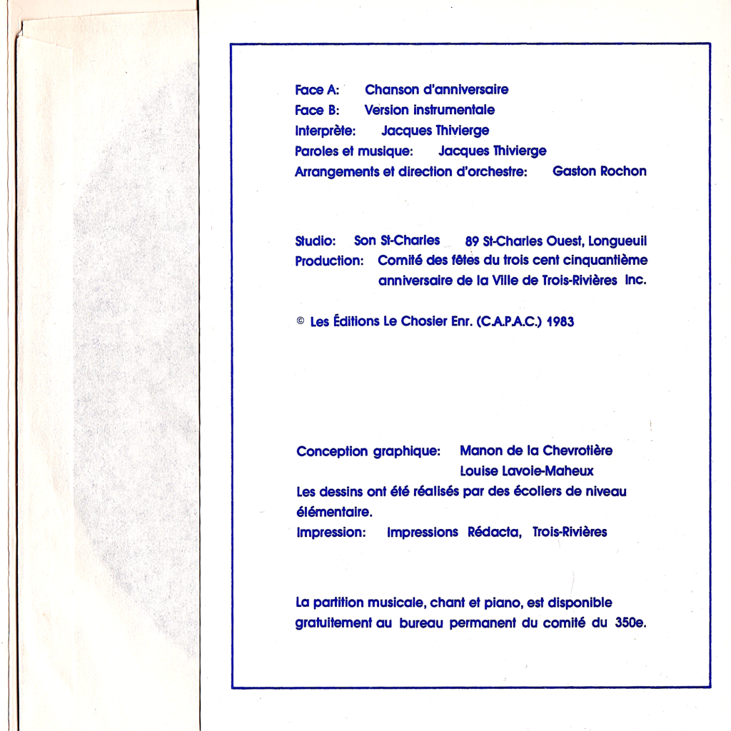 Un livre-pochette accueille le 45 tours de la chanson du trois-cent cinquantième incluant les paroles accompagnées de jolis dessins d'enfants du primaire sur un papier de belle qualité.