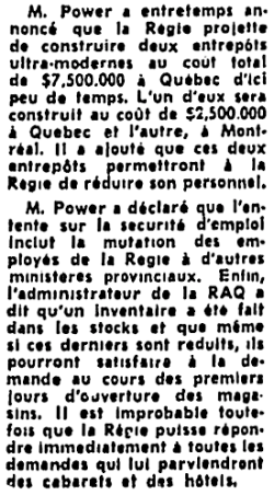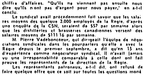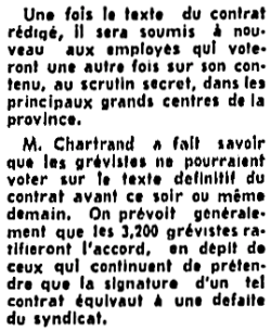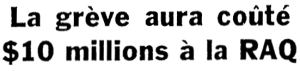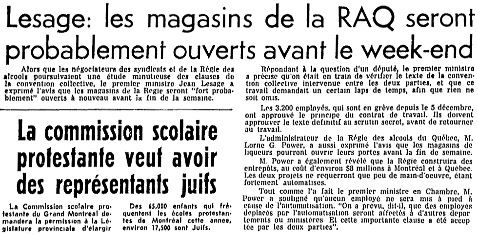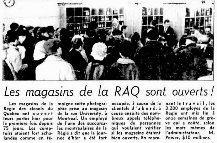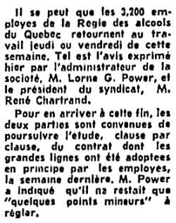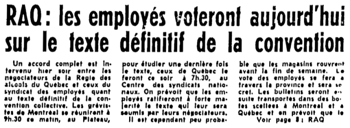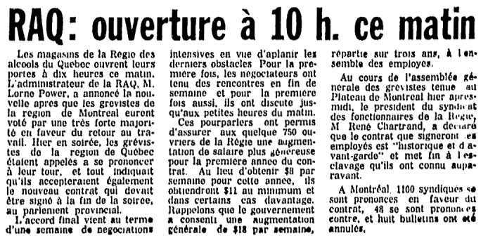 Entente de principe intervenue entre MM Marchand, Pépin, Bolduc et Lesage. Elle doit être soumise dans les prochains jours aux membres du syndicat des différentes régions. Cela peut prendre encore un certain temps avant la ré-ouverture des magasins de la RAQ.
