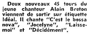 Alain Breton a plusieurs 45 tours et un long-jeu à son actif... Par contre, les articles de journaux à son sujet semblent très rares!