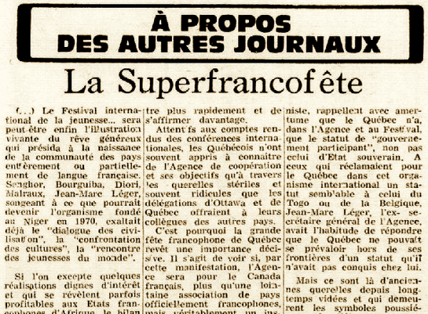 Le Festival international de la jeunesse francophone, la Superfrancofête, a lieu à Québec et à Sainte-Foy du 13 au 24 août 1974. L'événement, qui permet de créer des liens entre les citoyens de la communauté francophone internationale, met en vedette plusieurs artistes de renom.