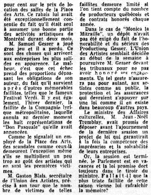 Déjà contestée par la famille de Monica, cette comédie musicale d'envergure a connu aussi une fin tragique après sa troisième représentation. Le producteur, M Sam Gesser, a déclaré faillite et a tout arrêté au grand étonnement général et surtout celui des artistes et des artisans qui avaient mis tant d'efforts et tant de coeur à produire ce spectacle... Deux mois de travail pour un mois de chômage sans avoir la certitude d'être payé un jour! La belle aventure s'était transformée en cauchemar...