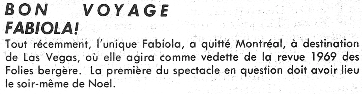 En 1969, elle fut la première québécoise à tenir l’affiche d’un spectacle à Las Vegas; elle était la meneuse de revue des « Folies Bergères » présentées à l’hôtel Tropicana.
