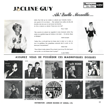 Jacline Guy a débuté sa carrière sous le nom de Jacquie Lynn et a au moins un disque sur étiquette Aladin.