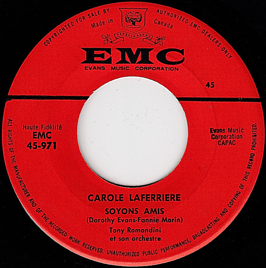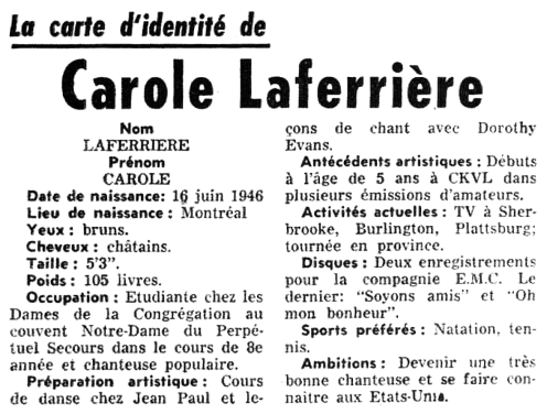 Chanteuse originaire de Montréal, Carole Laferrière a réalisé ses deux seuls 45 tours avec la maison de disques EMC à l'âge de 11 ans. Elle a suivi des cours de chant avec Dorothy Evans dont le nom apparaît sur au moins trois des titres