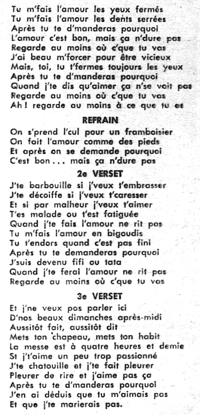 Nous sommes en 1962. Jean-Pierre Ferland présente cette chanson sur son deuxième album dans un contexte où la religion et les bonnes moeurs occupaient une place très importante, pour ne pas dire toute la place, dans notre société puritaine (du moins en apparence).
