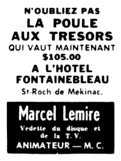 Vers 1962, apparition d'un nouveau jeu appelé "La poule aux trésors" (référence au populaire jeu télévisé "La poule aux oeufs d'or) animé dans les cabarets par Marcel Lemire.