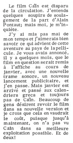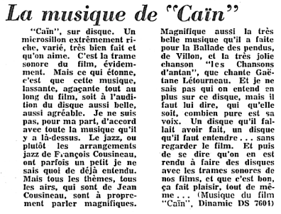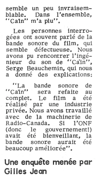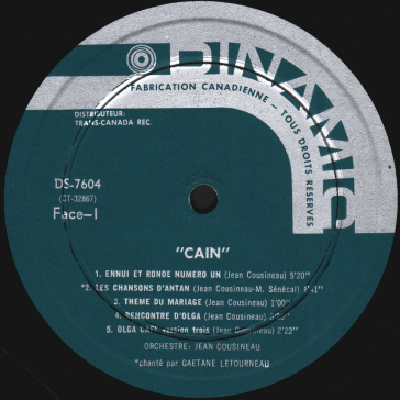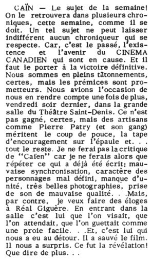 Coopératio Inc. présente Caïn d'après un roman inédit de Réal Giguère, Les Marcheurs de la nuit. Mise en scène de Pierre Patry. Une adaptation cinématographique de Pierre Patry, Jean-Claude Lord, Louise Beaulieu. Texte : Hubert Aquin d'après un scénario de Jacques Proulx. Avec Réal Giguère, Ginette Letondal et Yves Létourneau, Gabbi Sylvain avec Yvon Dufour, Ronald France, Gaétane Létourneau, Teddy Burns-Goulet, Rose Rey Duzil. [Générique de fin] Directeur de la photographie : Jean Roy. 1er assistant cameraman : Claude Charron. 2e assistant cameraman : Alain Dostie. Photographe : Martial Filion. Publicité : Joachin Cornelier, André Lafrance. Machinistes : Walter Allen, Roger Tremblay. Ingénieur du son : Yvon Bertrand. Percheman : Serge Beauchemin. Repiquage : Joseph Champagne. Mixage : Omega Production : Yvan Nicolov. Assistante générale : Raymonde Roy. Adjoint à la production : Michel Maheu. Assistant réalisateur : Jean-Claude Lord. Régisseur : Bernard Lalonde. Script-girl : Louise Beaulieu. Monteur : Lucien Marleau. Assistant monteur : Jean-Pierre Masse, Yves Langlois. Monteur sonore : Bernard Bordeleau. Monteur négatif : Lyse Savard. Musiques : Jean Cousineau. Edition : Dinamic. Enregistrement : Roger Bélair. Chanson «La Ballade des pendus» - Paroles : François Villon. Chanson «Les Chansons d'antan» - Paroles : Marie Sénécal. Collaborateurs : Salon Art et Coiffure de Paris, Maison Jules D'Alcantara, fleuriste, Gagné Automobile Ltée, Maison Lajeunesse Inc. et les services techniques de Trans-World Film Laboratories, Omega Production Inc., Les Films Delta Inc., Bill Fowler, J. P. Paquette Transport, Techno Film, Walter C. Allan Inc., Claude Charron Photo Studio Enrg. Les laboratoires Mont-Royal Inc. Directeurs de la production : Pierre Patry, Jean Roy. Une production Coopératio Inc.