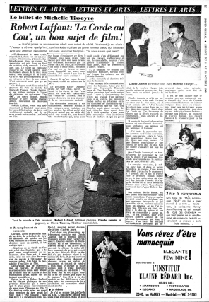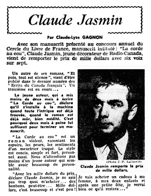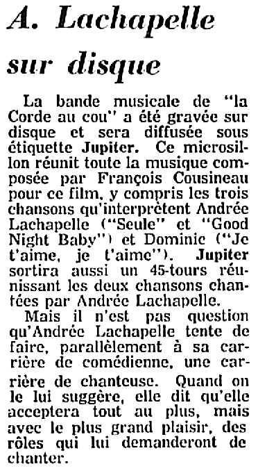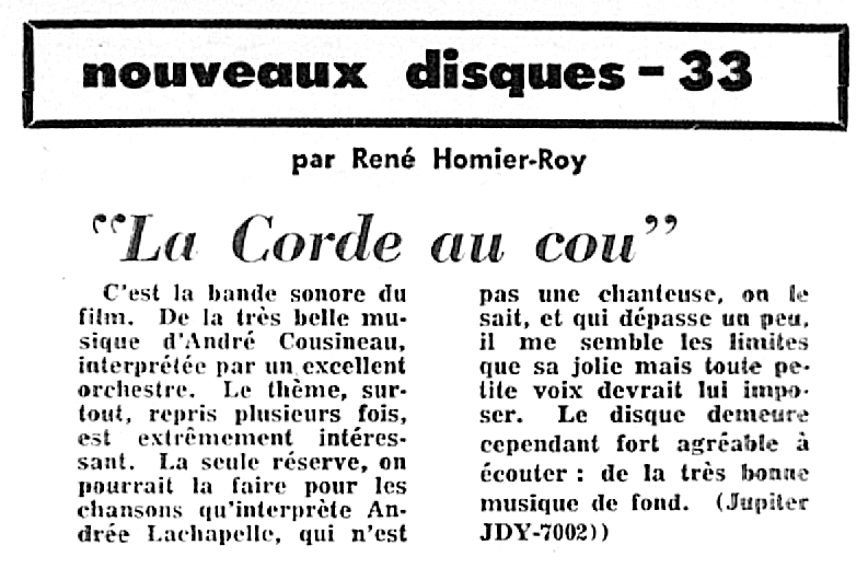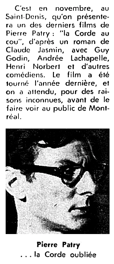 Cooperatio présente La corde au cou. Avec : Guy Godin, Andrée Lachapelle, Henri Norbert, Jean Duceppe, Rolland D'Amour, Denise Pelletier, Gabbi Sylvain, Monique Sirois. Réalisation et mise en scène : Pierre Patry. Scénario : Claude Jasmin et Pierre Patry. Dialogues : Claude Jasmin. D'après un roman de Claude Jasmin (Prix du Cercle du Livre de France). [Générique de fin] Avec : Andrée Boucher, Ernest Guimond, Gilbert Chénier, Camille Ducharme, Tania Fédor, Jacques Auger, Henri Deyglun, Richard Martin, Jean-Louis Millette, Lucie Mitchell, Gilles Normand, Jean-Louis Paris, Guy L'Ecuyer, Ronald France, Gaétan Labrèche, Jacques Aylestock, Jean Clocher, Lise Bonheur, Nana de Varennes. Gérant de location : Jacques Gibault. Régisseur : Bernard Lalonde. Assistant de production : Michel Maheu. Directeur de la photographie : Jean Roy. Son : Yvon Bertrand. Montage : Lucien Marleau. Montage sonore : Jean-Pierre Joutel. Mixage : Michel Belaïeff. Script-girl : Louise Beaulieu. Photographe : Claude Charron. Directeur de la production : Pierre Patry et Jean Roy. Assistants à la caméra : Alain Dostie et Raymonde Roy. Electriciens : J. Paul Paquette et Roger Tremblay. Effets sonores : Serge Beauchemin. Post-synchro : Yvon Charette et André Séguin, Synchro-Québec. Edition : Les Editions Musicales Dulau. Enregistrement : Gatien Roy, Stéréo Sounds Studios. Paroles d'Alexandre chantées par Andrée Lachapelle («Je t'aime»). Paroles d'Alexandre chantées par Dominic. Assistant monteur : Jean-Pierre Masse. Assistants réalisateurs : Jean-Claude Lord, Louise Beaulieu. Montage négatif : Denise Lemieux. Trucages optiques : Claude Cardinal. Animation : Guy Gaucher, Jacques Jarry, Briston Films Limited. Typographie : J. Paul Trépanier. Remerciements : Duval Motors Ltée, Brasserie Dow, Compagnie Rolls Royce, Parc Belmont, Les Corps policiers de la province de Québec, Le Tropicana, Maison Jules d'Alcantara fleuriste, Le Gobelet, Atlantic Helicopters, Faucher Ltée, The Dog Castle, Volkswagon Sales Service. Publicistes : Joachim Cornellier, Jean Jasmin, André Lafrance. Services techniques de : Alex L. Clark, Claude Charron, Photo Studio Enrg. Omega Productions Inc., Pathé Deluxe of Canada, Jack Zolov, J. P. Paquette Transport, Les laboratoires de films Transworld, Photo Supply, Techno Film, Laboratoire Mont-Royal Film Corporation.