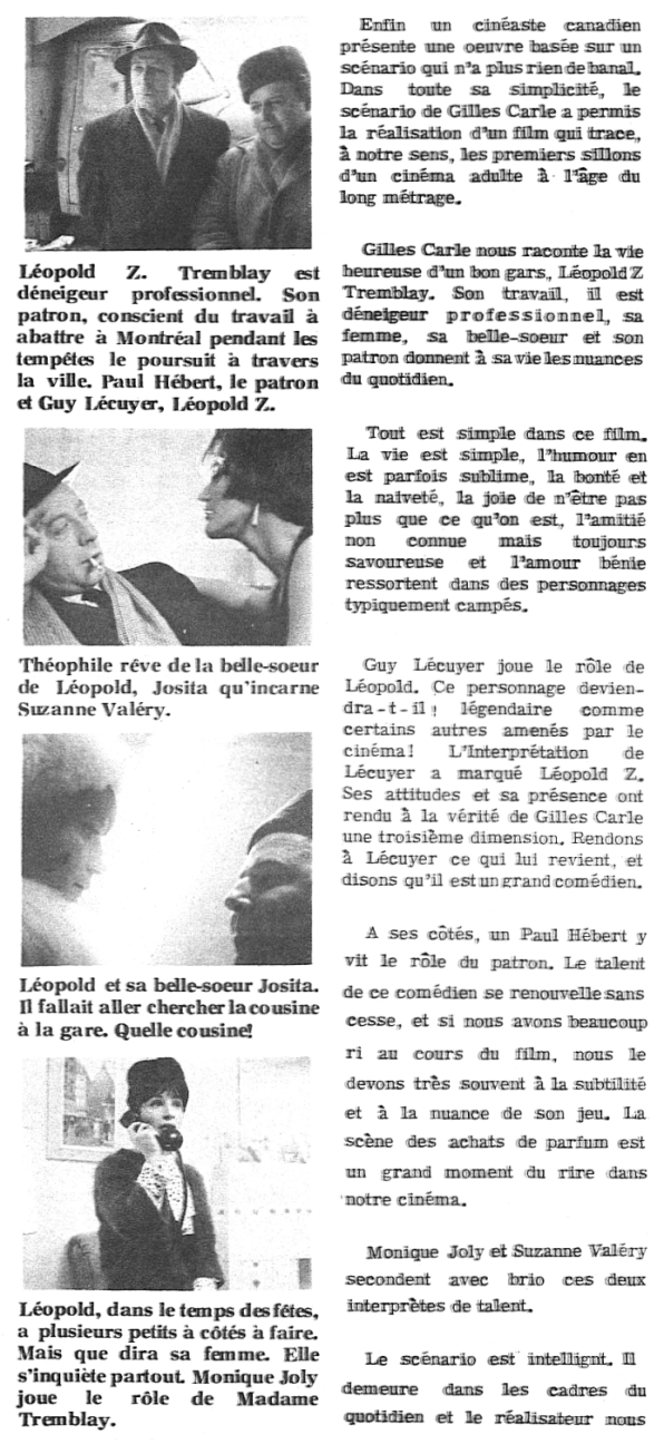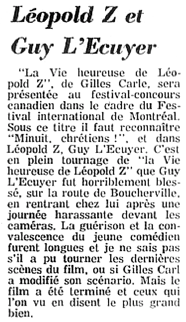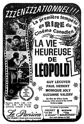 Montréal, un 24 décembre. Une Voix cherche à se faire entendre. Canada. L'Office national du film présente La vie heureuse de Léopold Z. Avec Guy L'Ecuyer, Paul Hébert, Suzanne Valery, Monique Joly, Jacques Poulin, Gilles Latulippe, Bernard Lapierre, André Gagnon. Narrateur : Albert Millaire. Annonceur : Raymond Lemay. Le R. P. Léandre Brault dirige la maîtrise des Petits Chanteurs du Mont-Royal. Un film de Gilles Carle. [Générique de fin] Directeur artistique : Jean-Claude Labrecque avec la collaboration de Bernard Gosselin. Montage : Werner Nold. Scénario et dialogues : Gilles Carle. Musique : Paul de Margerie. Enregistrement du son : Joseph Champagne. Montage sonore : Bernard Bordeleau. Assistants à la caméra : Doug Bradley, Al Morgan, Jacques Leduc. Régie : Léo Ewaschuk, Denis Boucher. Maquillage : Fernand Bastien, C. Pierre-Humbert. Préposée à la météo : Irène Nold. Post-synchronisation : Synchro-Québec Ltée. Mixage : Ron Alexander, Roger Lamoureux. Direction générale : Jacques Bobet. Nous remercions le Service de déneigement de la Cité de Montréal. La vie heureuse de Léopold Z. Fin. Office national du film. Canada. © 1965.