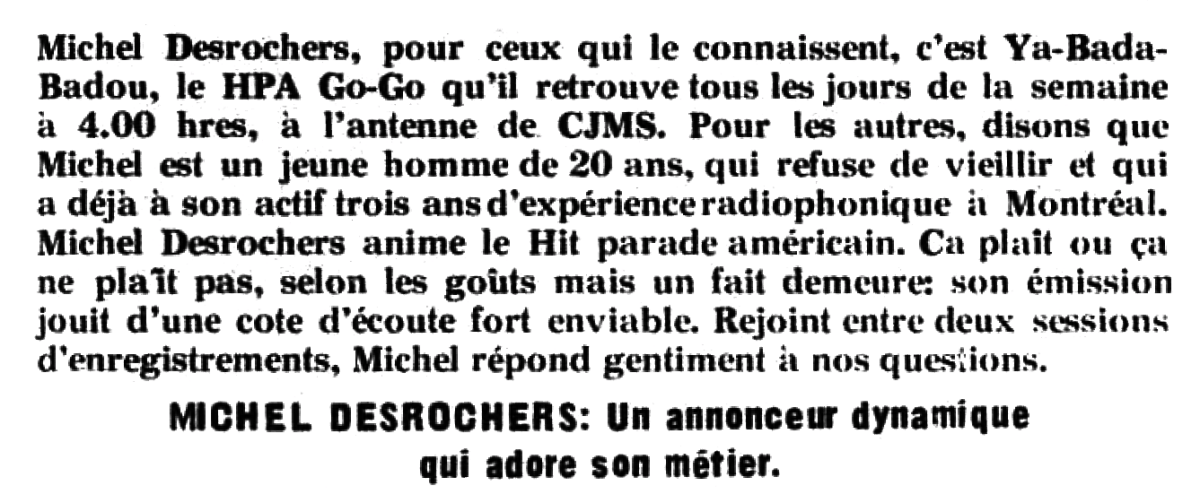 Michel Desrochers est né à Montréal le 4 juin 1945. Après son séjour à CJMS, il devient animateur de l'émission du matin à CBF (SRC). Il a poursuivi une carrière à la radio pendant plus de 20 ans, travaillant notamment à Europe 1 à la fin des années 1960 puis à Radio-Canada et à CKAC. Il anime également une émission à la télévision de la SRC dans les années 1980.