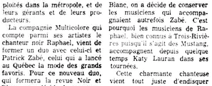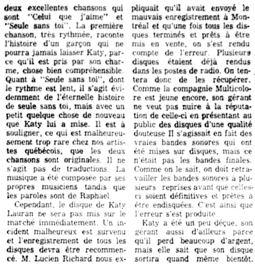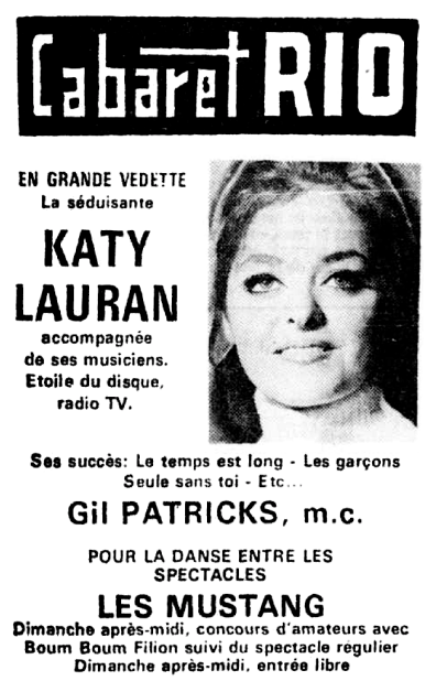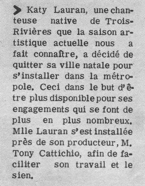 Jeune chanteuse Trois-Rivières, Katy Lauran (Denise Vanasse) a produit trois 45 tours pour trois maisons de disques différentes: Trans-Canada, Franco-Élite et Musicolore.