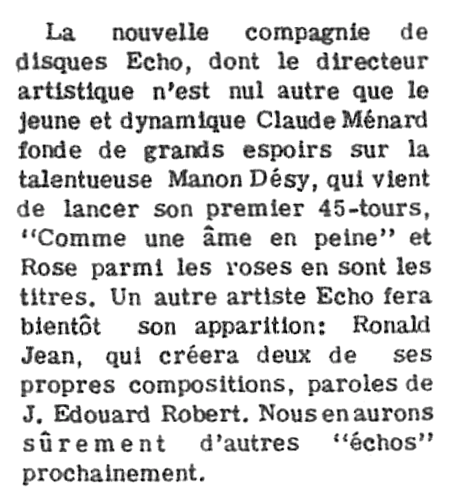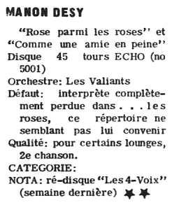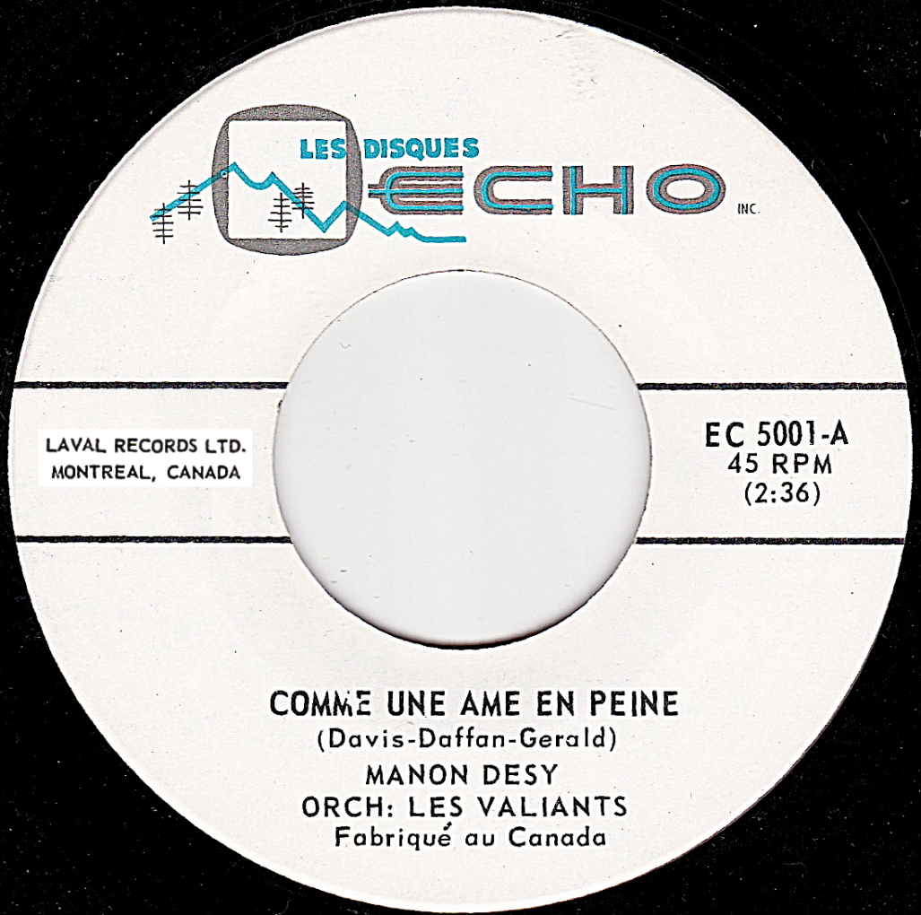 En 1965, le groupe "Les Valiants" ont accompagné Manon Désy sur son unique 45 tours pour une nouvelle maison de disques, la compagnie "Écho". Cette jeune chanteuse ne semble pas avoir laissé beaucoup de traces dans les journaux à potins. Vers la fin des années soixante-dix, elle refait surface en poursuivant sa carrière dans les cabarets.
