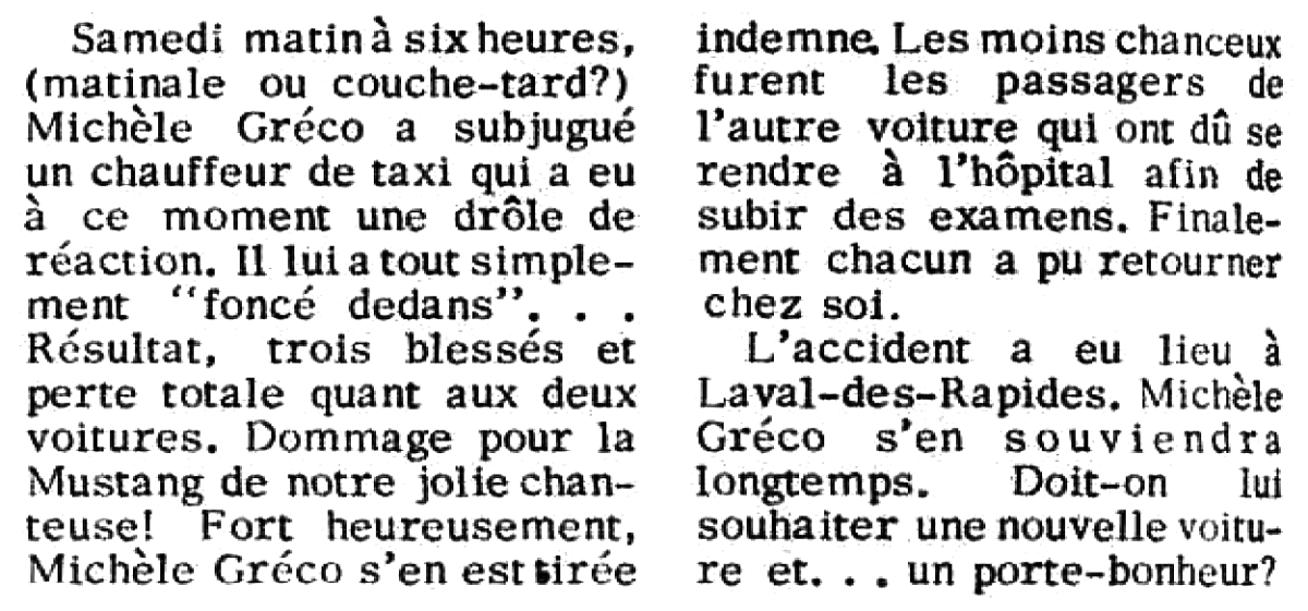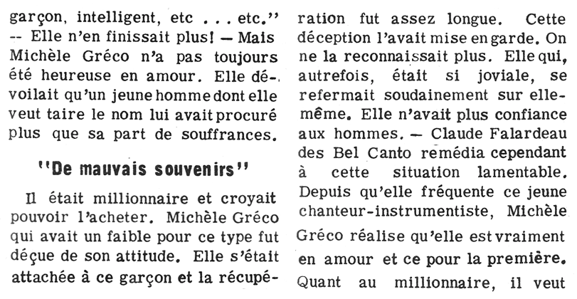 En septembre 1966, Michèle Gréco épousa Claude Falardeau des Bel-Canto. Ce dernier quitta le groupe en 1968 et forma avec sa conjointe le duo "Elle et Lui".