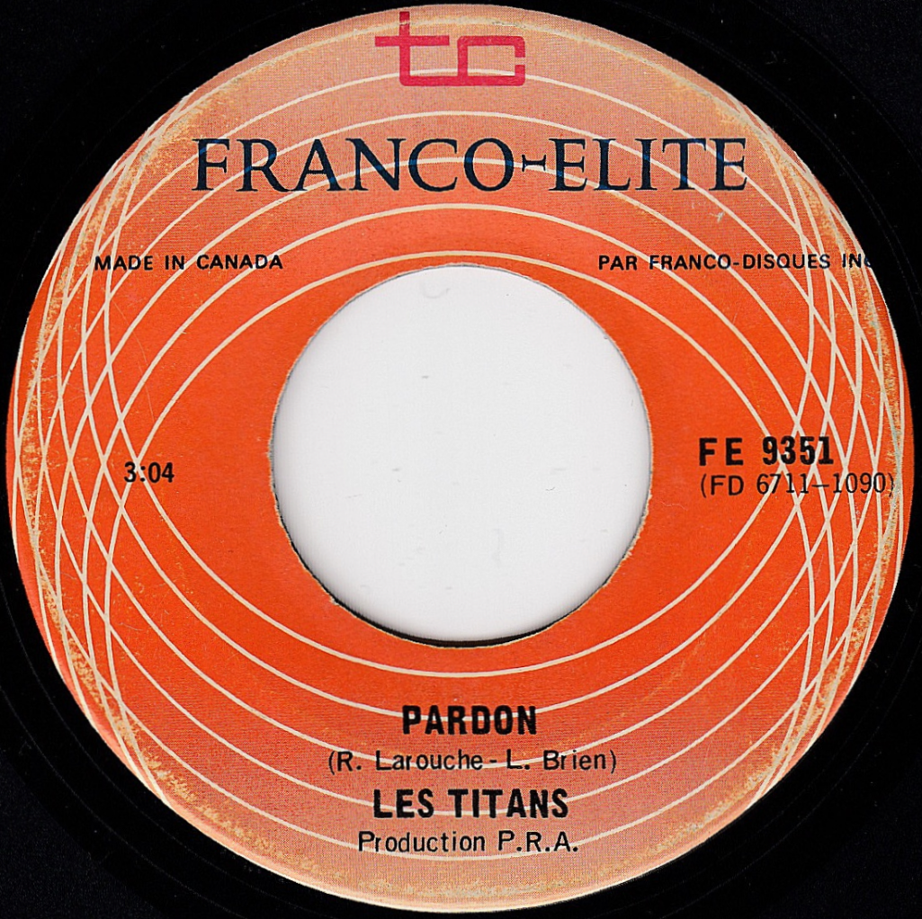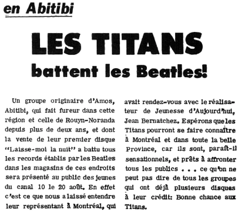 En 1964, Raymond Larouche (chant et guitare), Serge Vachon (guitare basse), Alain Plante (piano) et Réjean Goyette (batterie) deviennent "Les Titans". À leurs débuts en 1963, ils se nommaient "Les Jaguars". Constatant qu'un autre groupe existait déjà sous cette appellation, ils ont changé pour "Les Safari", mais pas pour très longtemps. Ils viennent tous d'Amos. Ils parcourent les salles de danse de leur région où on les apprécie énormément. En 1966, ils participent à la finale du concours "28 jours" de Jeunesse Oblige à la télé de Radio-Canada. Ils finissent deuxième dans leur catégorie. Remarqués par un représentant de la maison de disques "Choc", ils enregistrent peu de temps après leur premier disque. Un autre suit vers la fin de l'année. 1967 marque la fin de leur aventure sur disque avec une dernière parution sur étiquette Franco-Élite. Cela ne les empêche pas de poursuivre leur carrière qui prendra fin en 1974.