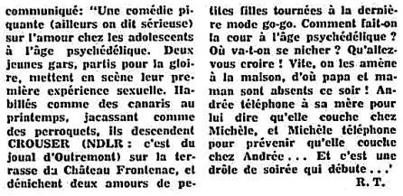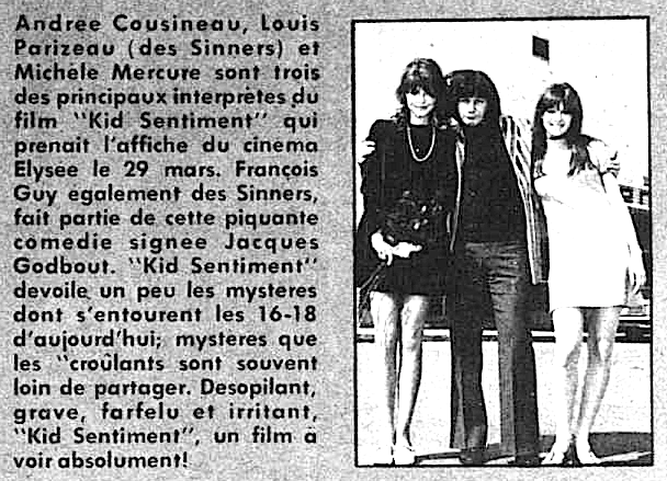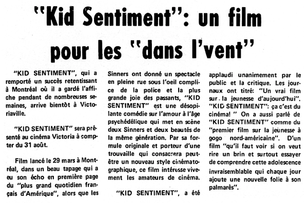 Entre fiction et documentaire, ce long métrage de Jacques Godbout pose un regard critique sur la jeunesse québécoise des années 1960. Kid Sentiment, c'est l'adolescent qui dit non à la tendresse parce qu'elle est gênante. Sur le thème de l'initiation amoureuse, la caméra se fait témoin de cette jeunesse lucide, drôle, amie du bruit et de l'excentricité. Réalisé avec la participation de deux membres du groupe de chanteurs yéyé, les Sinners.